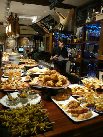 And in northern Spain, especially in the Basque region, you can make a lunch or a dinner from the pintxos (pronounced pinchos) offered in almost every bar.
